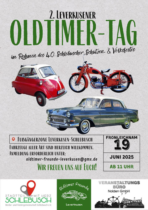 Am Donnerstag, den 19. Mai (Fronleichnam) findet der 2. Leverkusener Oldtimer Tag statt. Er ist für Old- und Youngtimer aller Art. Egal ob PKW, Motorad, Traktor, LKW oder Militärfahrzeug, kommt alle vorbei und präsentiert eure Fahrzeuge in der wunderschönen Fußgängerzone in Leverkusen-Schlebusch. Eine Anmeldung ist erforderlich. Weitere Informationen unter: oldtimer-freunde-leverkusen@gmx.de