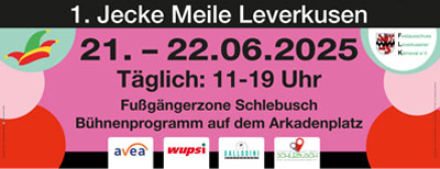 Am 21. und 22. Juni findet parallel zum beliebten Schlebuscher Volksfest erstmals die 1. Jecke Meile Leverkusen statt. In der Fußgängerzone präsentieren sich zwei Tage lang die Leverkusener Karnevalsvereine mit bunten Ständen, Aktionen und Infos rund um das jecke Brauchtum. Auf dem Arkadenplatz erwartet die Besucher zusätzlich ein abwechslungsreiches Bühnenprogramm.